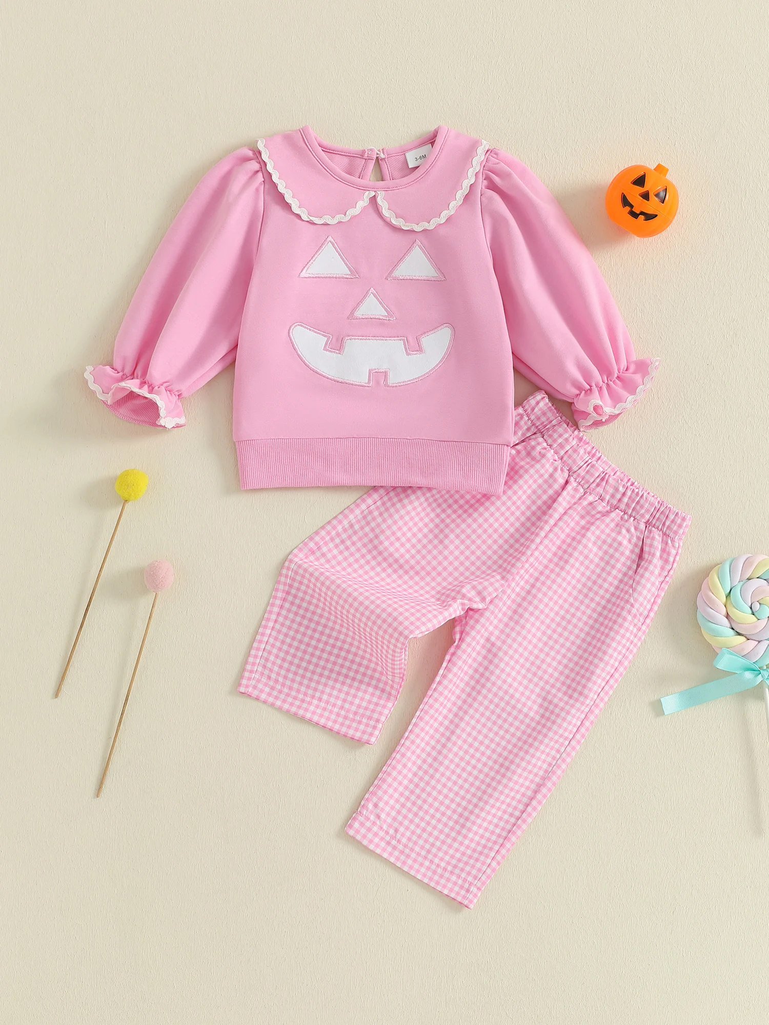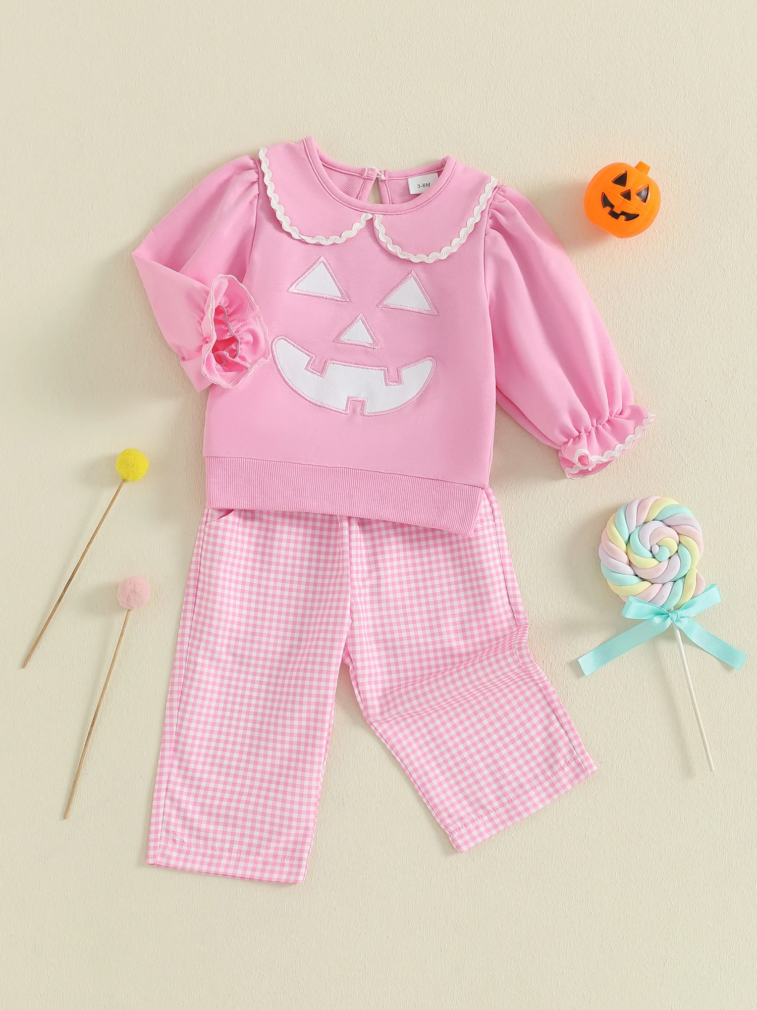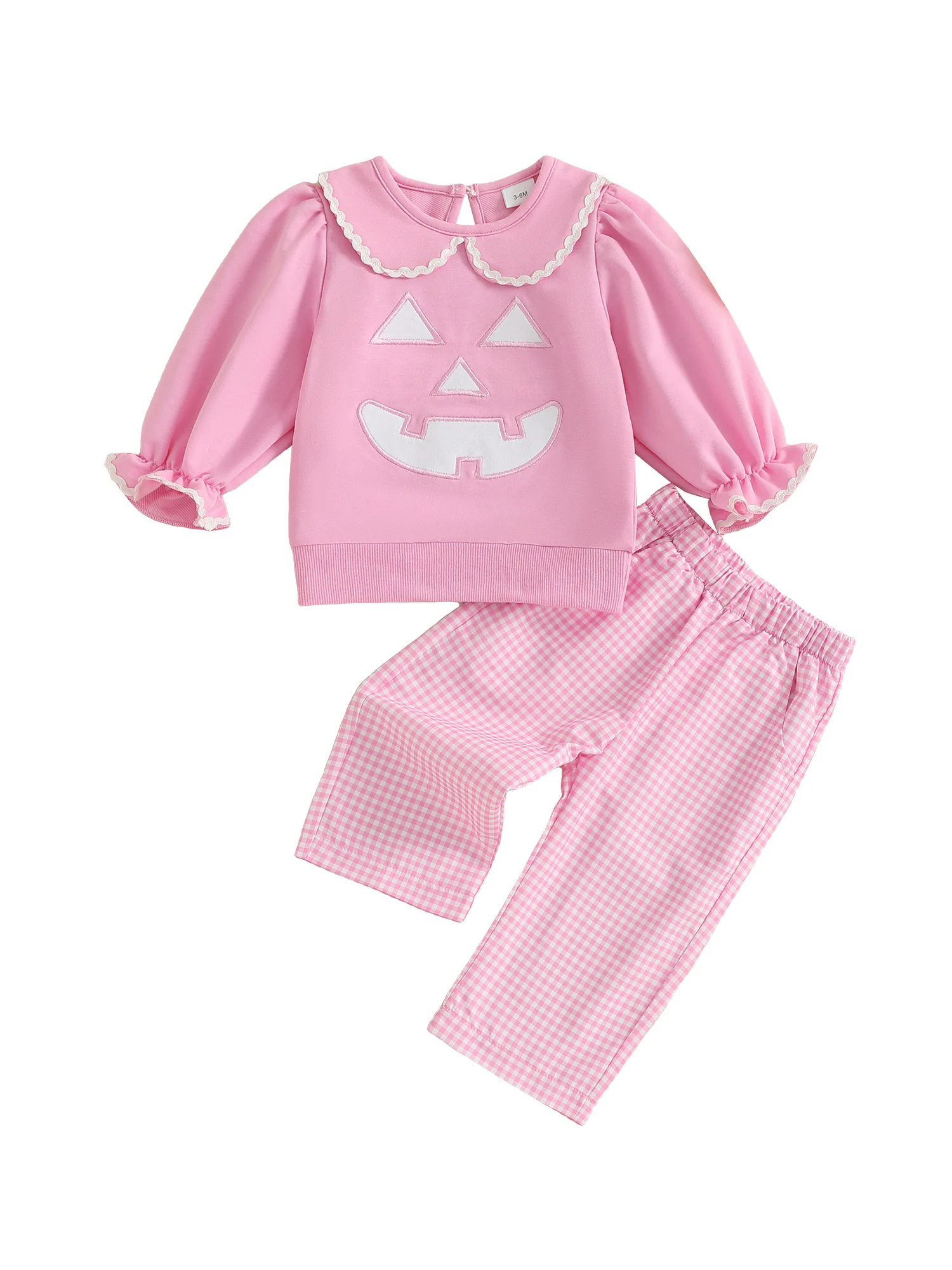 Toddler Girl Halloween Outfits Pumpkin Face Embroidery Long Sleeve Doll Collar Pullover + Elastic Plaid Pants 2 Pcs Set
