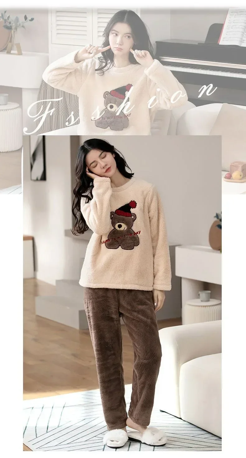 Name: School pajamas,women pajamas,Long sleeve,Loungewear,Homewear,Pants,Lounge wear,Birthday Gifts,White Day,Christmas Eve,Winter Easter,Hip-Hop,Plus Size,Kawaii,Cartoon Bear,Elastic Waist,O-neck,Breathable,Simple,Thickened,Korean,Fashion,Autumn,Winter,early snow,Plush Thick,Hat Bear